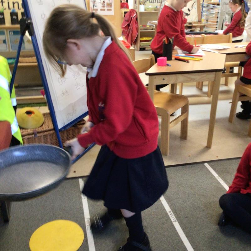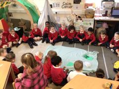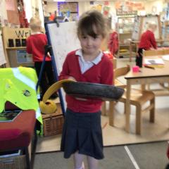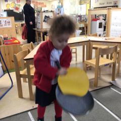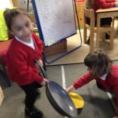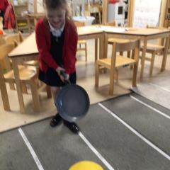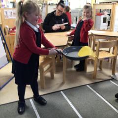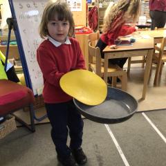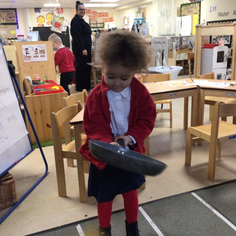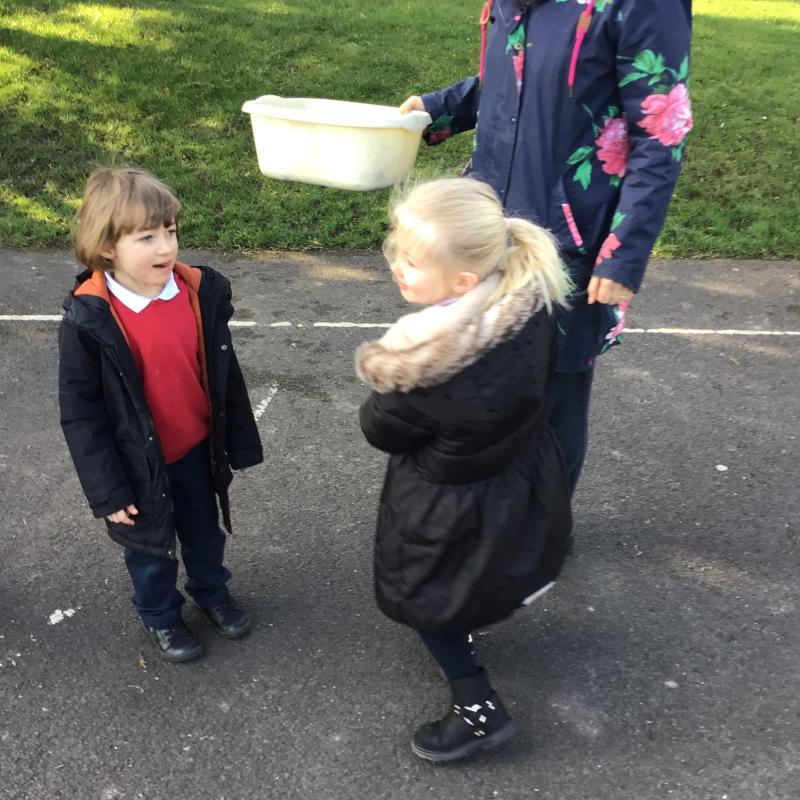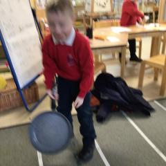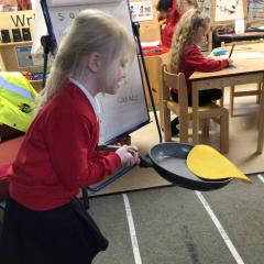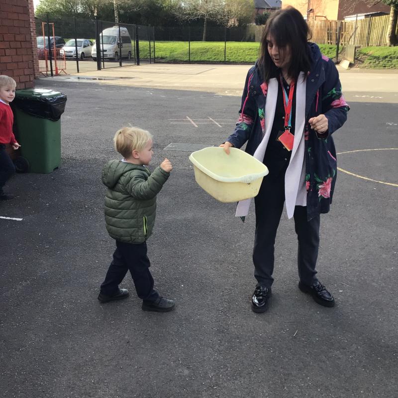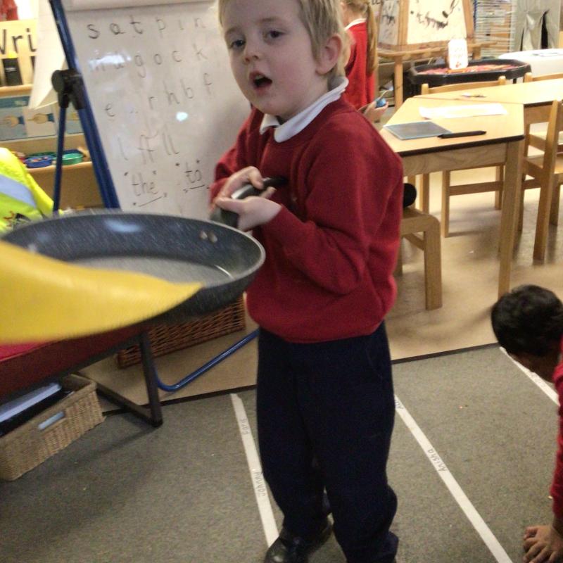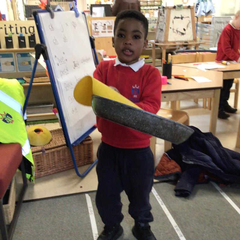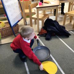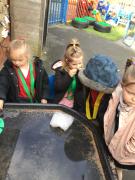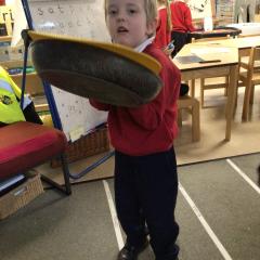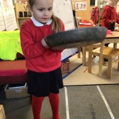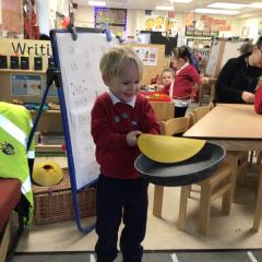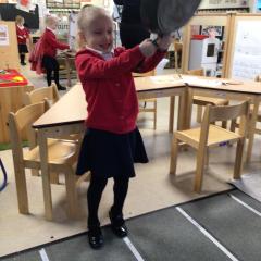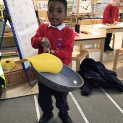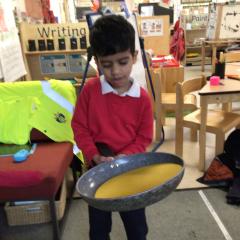 The children have been looking at the text 'Whatever Next' and have been role playing the story. The children explored the props that Baby Bear gathered to take to the moon. The children looked at what Baby Bear used as a helmet- a colander. We found a colander in our water area and explored how and what it is used for, in addition to being a helmet for Baby Bear. The children explored how the rain was able to get through the holes.
