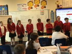 The children from Marsden class read their shared writes based on 'The Iron Man' story to the children from Rigby class.